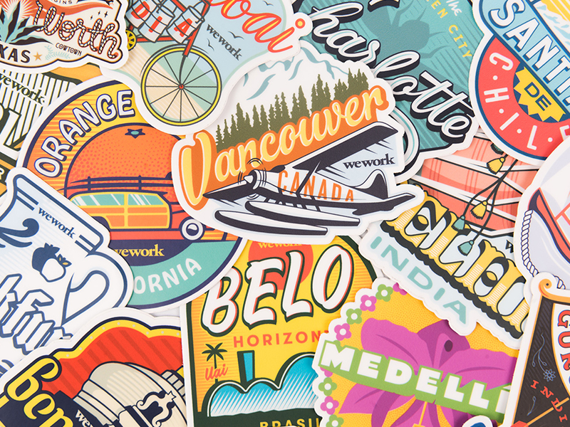 WeWork believes in having fun and reppin' local flavors with their city sticker designs. Never wanting to be tied down in tradition, our design team explored the history and culture of each new locale to create unique badges that authentically reflected their entrepreneurial and quirky spirit. By celebrating each city, the stickers built a sense of pride and unity at a new location while positioning WeWork as a global brand with a local focus. In close collaboration with regional marketing teams, I designed many of the city stickers still used today.